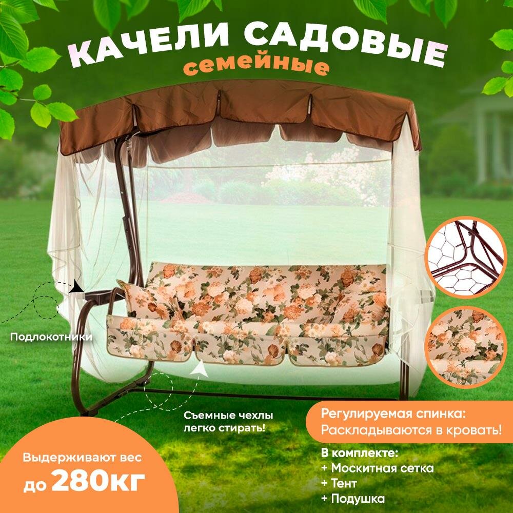 Качели садовые 3-х местные Мебельторг Турин Каркас коричневый/Бежевый рис.цветы