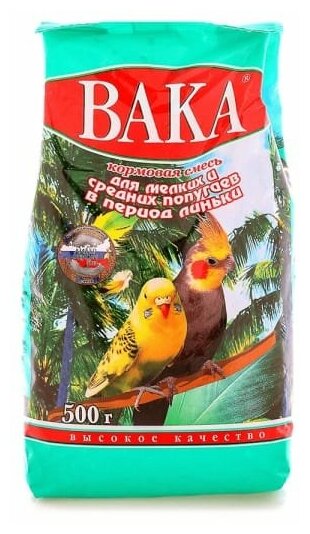 Вака "Высокое Качество" сухой корм для мелких и средних попугаев в период линьки, 0.5 кг