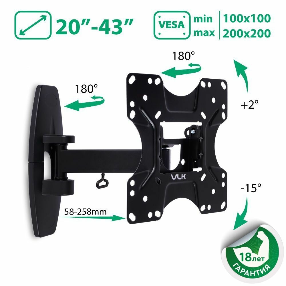 Кронштейн VLK TRENTO-5, для ТВ, наклонно-поворотный, 20-43", 58-258 мм от стены, черный