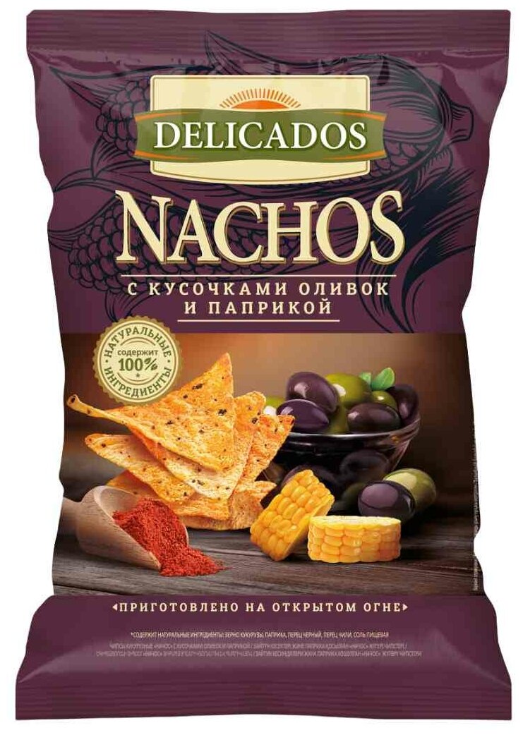 Купить Чипсы DELICADOS nachos кукурузные с кусочками оливок и паприкой, 150г.