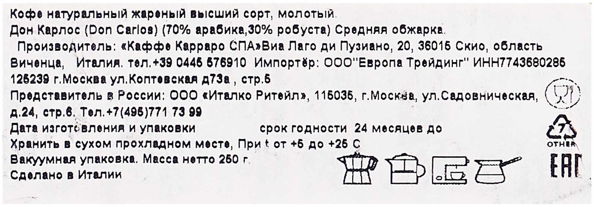 Кофе молотый Carraro Don Carlos, 250 г, вакуумная упаковка