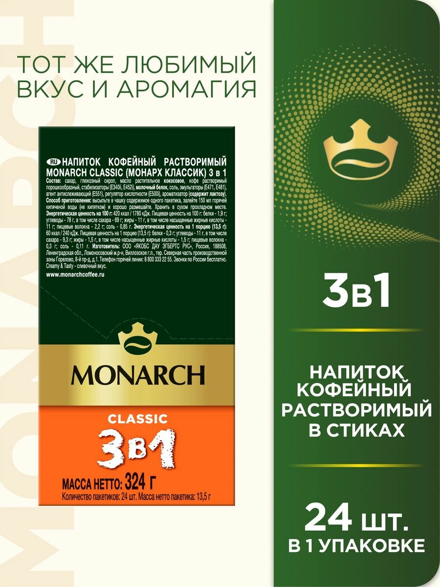 Напиток кофейный растворимый MONARCH 3 в 1 Классика, в стиках, 24 уп., 324 г
