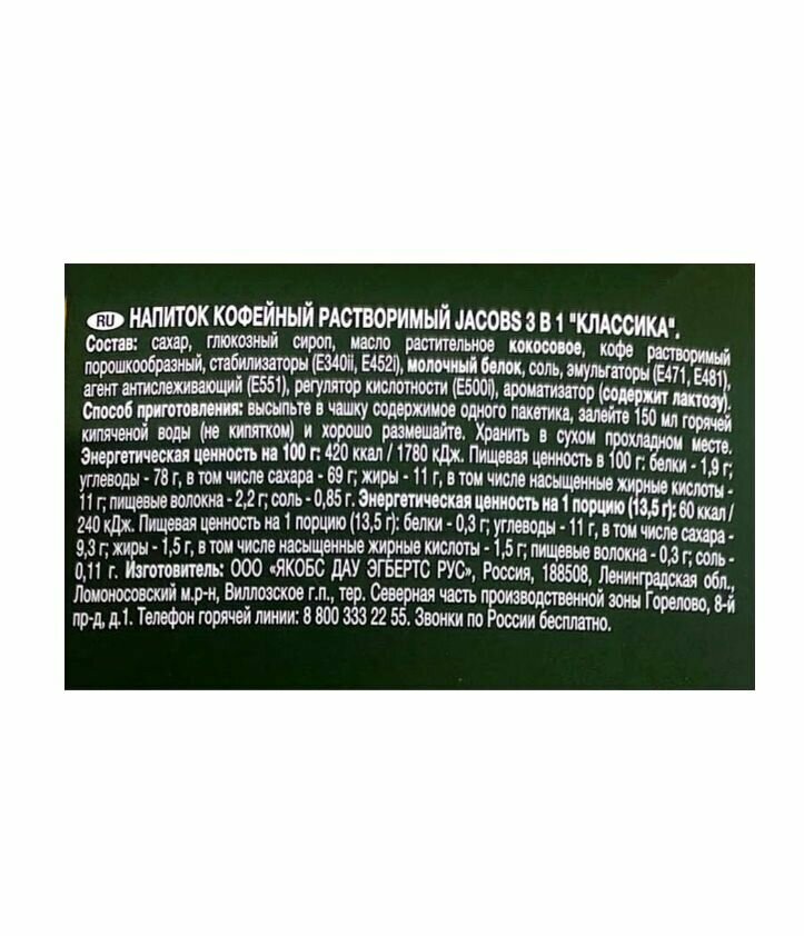 Напиток кофейный растворимый JACOBS 3 в 1 Классика, 13,5г х 24 шт