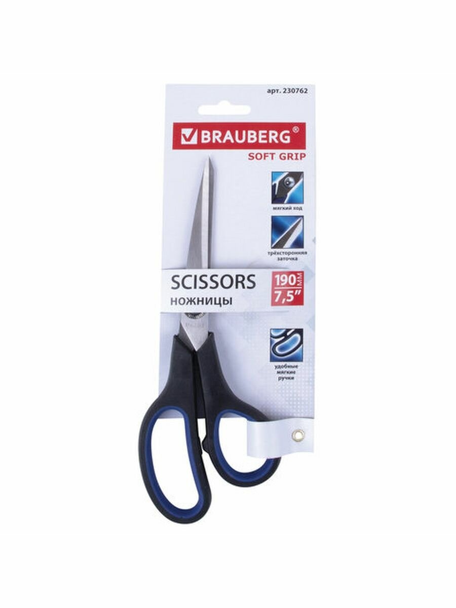 Ножницы BRAUBERG "Soft Grip", 190 мм, черно-синие, резиновые вставки, 3-х сторонняя заточка, 230762