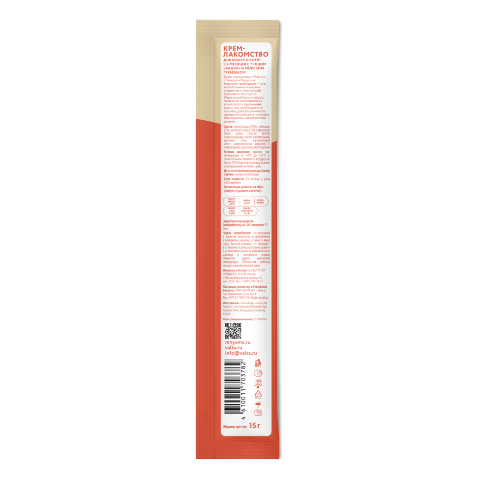 Мнямс, Крем-лакомство для кошек с тунцом Кацуо и морским гребешком 15г, 6 упаковок