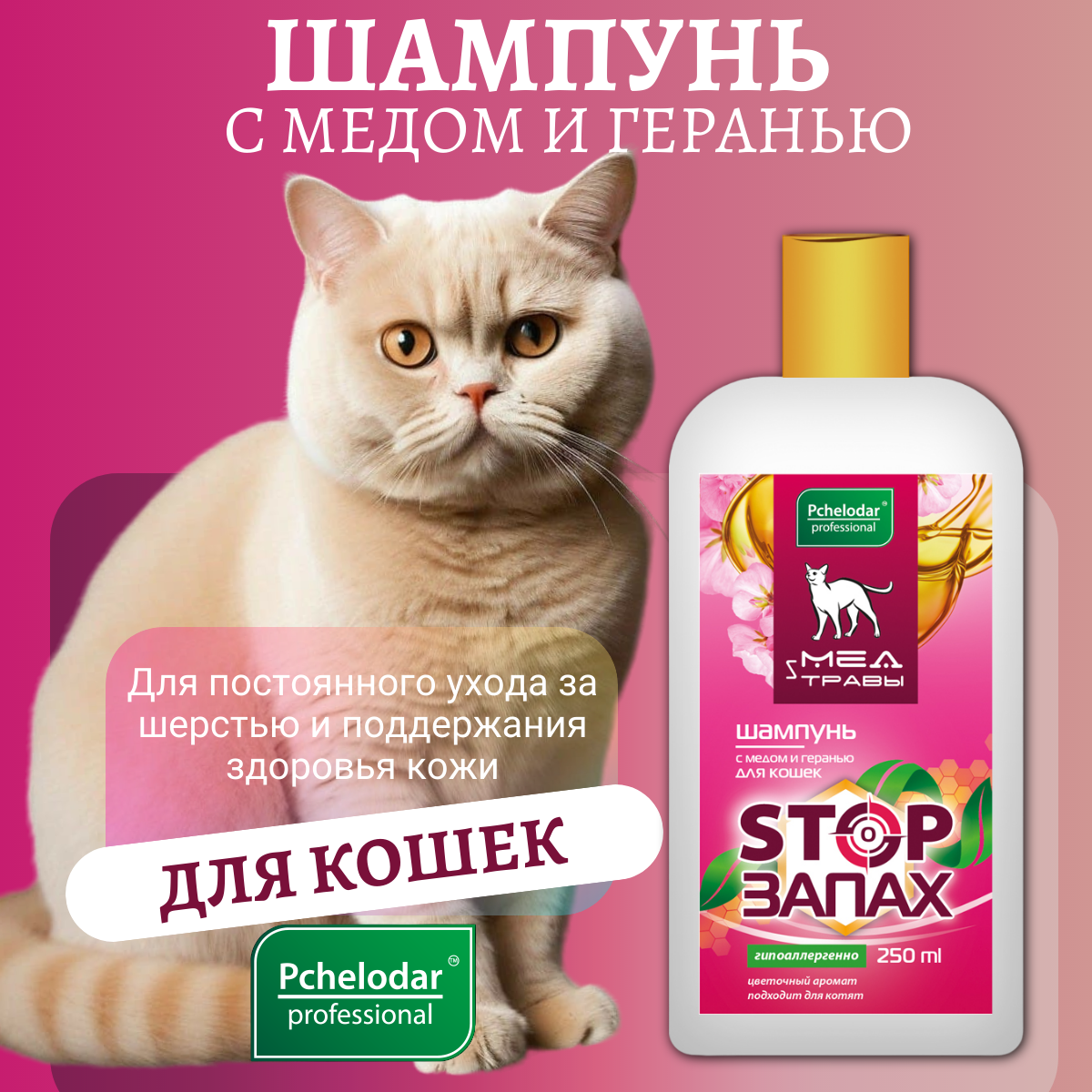 Купить Pchelodar С медом и геранью шампунь для кошек жидкий инсектоакароцидный без запаха 250 мл