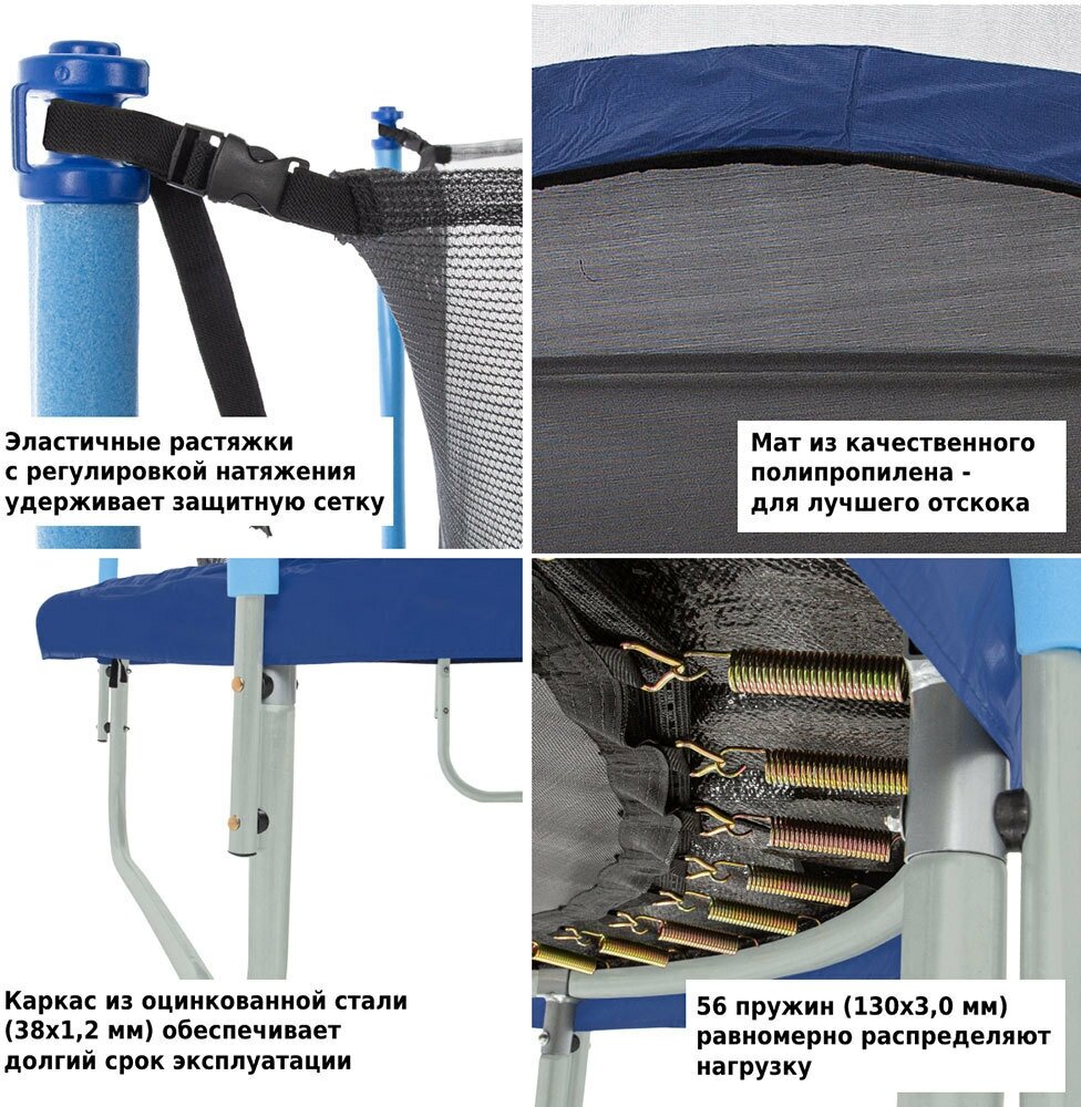 | Минусы: | При весе прыгуна более 100 кг батут начинает раскачиваться, надо крепить к земле. Не хватает лестницы в комплекте - маленьким детям сложно забираться. |