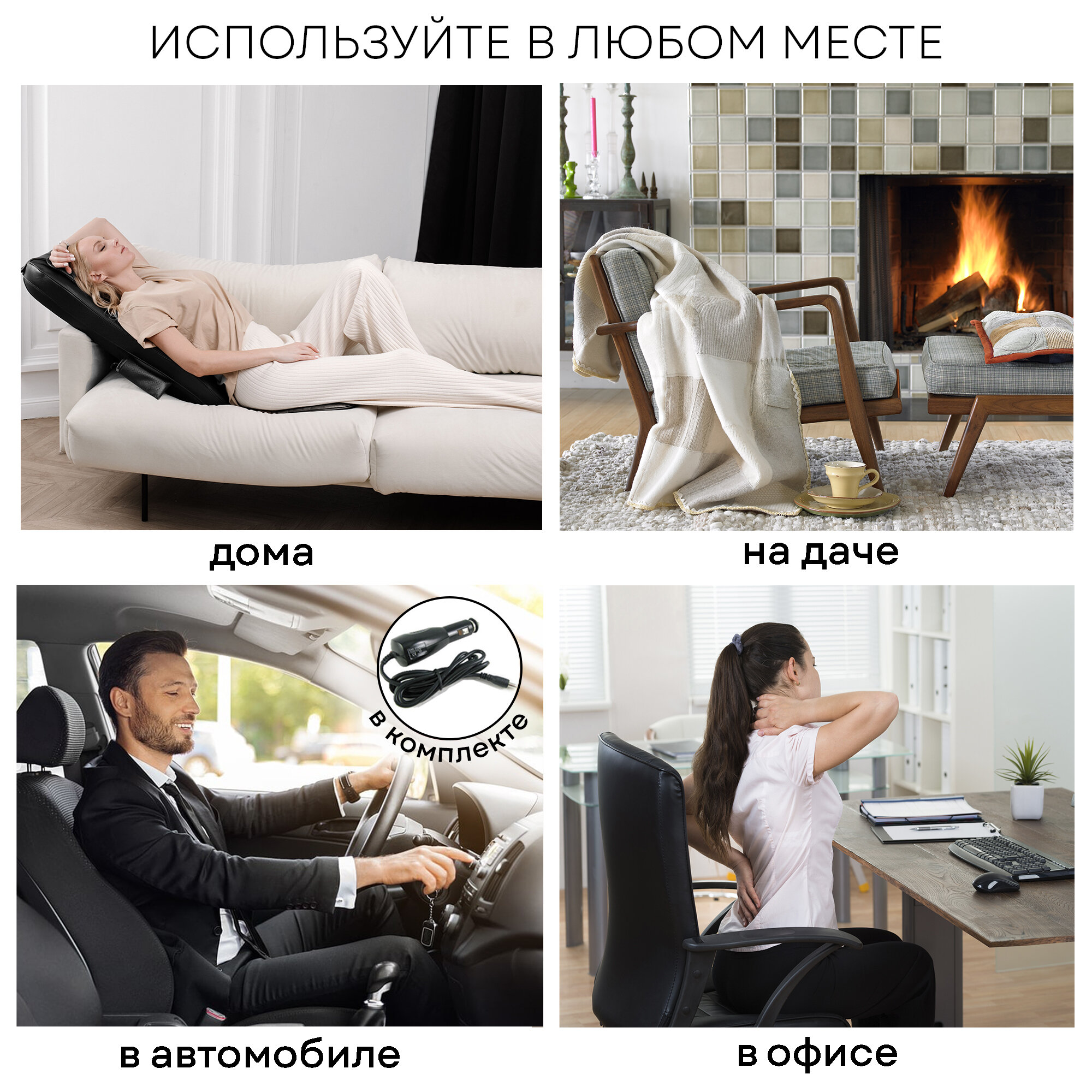 | Плюсы: | Массажные ролики с подогревом, вибрация, можно использовать дома от сети или в машине от прикуривателя |