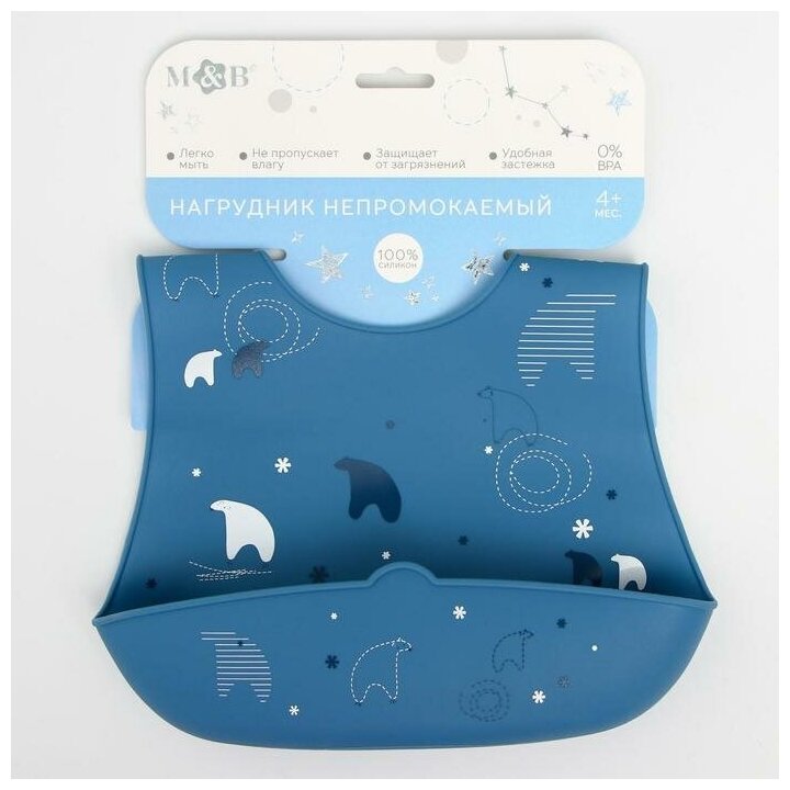 Нагрудник для кормления "Северный мишка" силиконовый с карманом, цвет синий