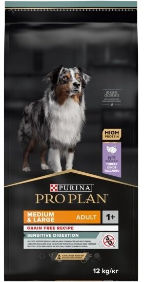 Pro Plan Grain Free Medium&Large корм для взрослых собак средних пород с чувствительным пищеварением Индейка, 12 кг.