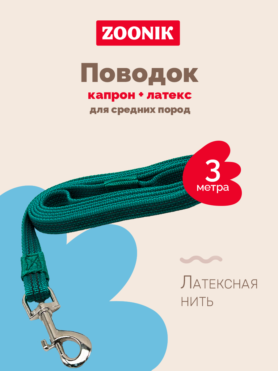 Зооник Поводок капроновый с латексной нитью 3м х 20мм, Зеленый