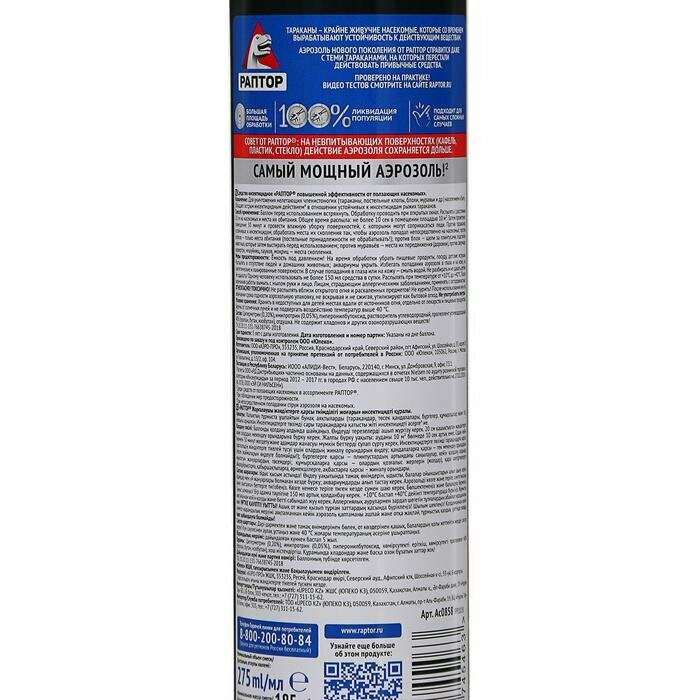 Аэрозоль от самых живучих резистентных тараканов, раптор, средство от тараканов, 275 мл