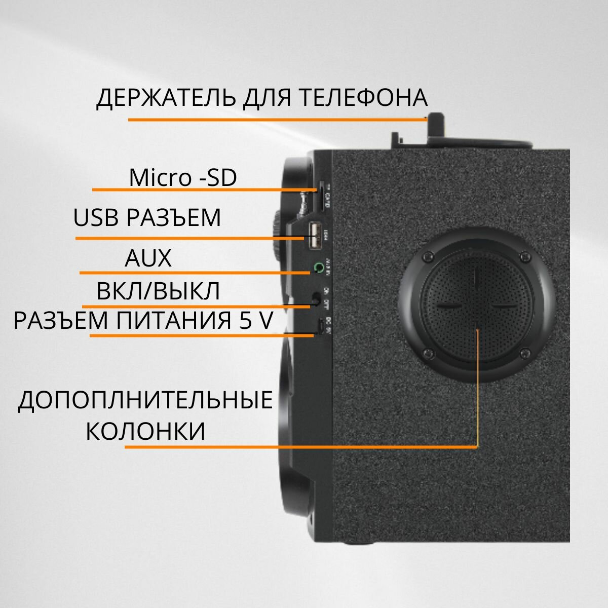 | Плюсы: | Купил несколько месяцев назад. Слушаем музыку на шашлыках, по звуку претензий нет, чистый живой звук. Наверху удобная подставка для смартфона, включаем ребенку мультики. |