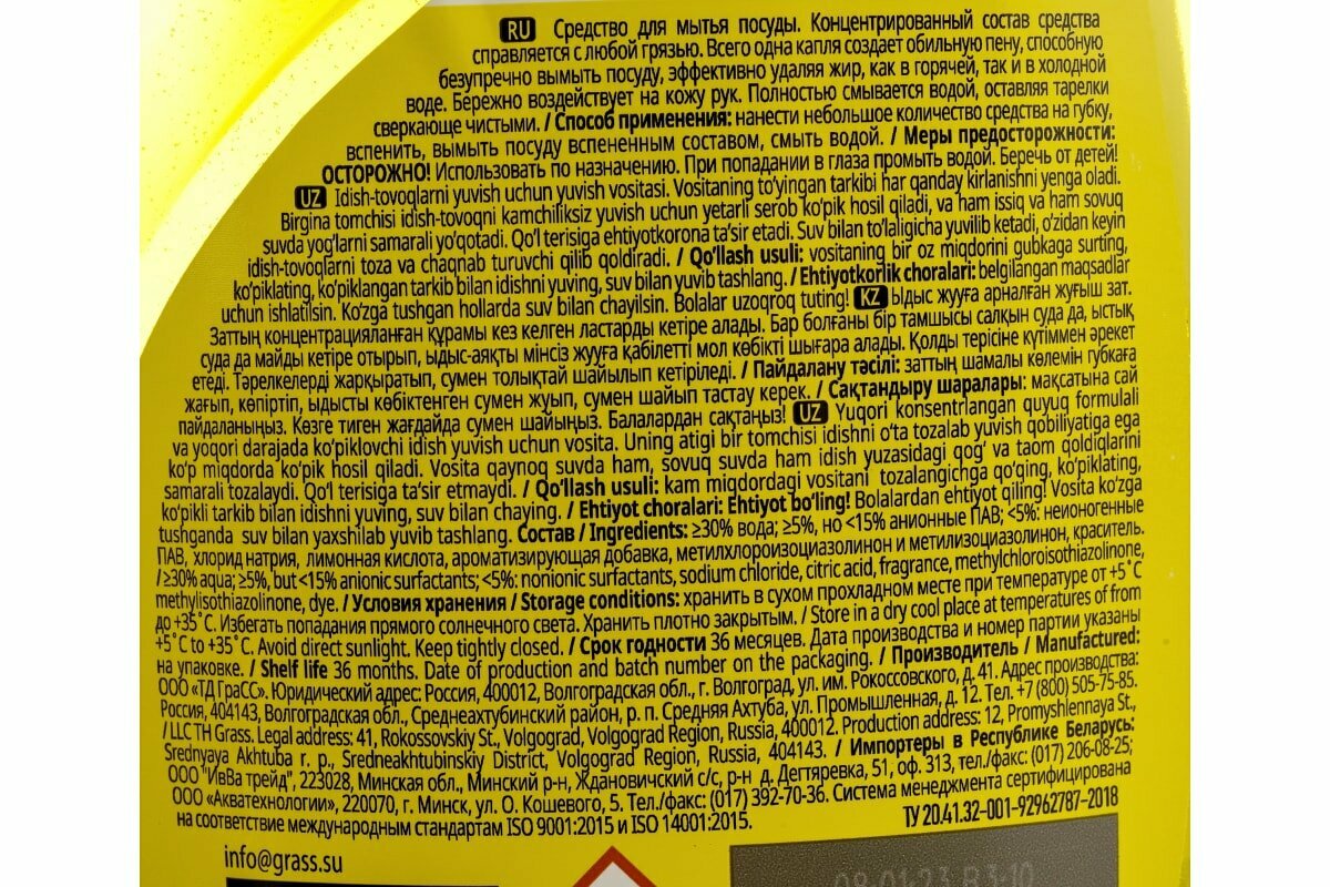 Grass Средство для мытья посуды универсальное моющее гель для кухни Velly лимон 500 мл 125426