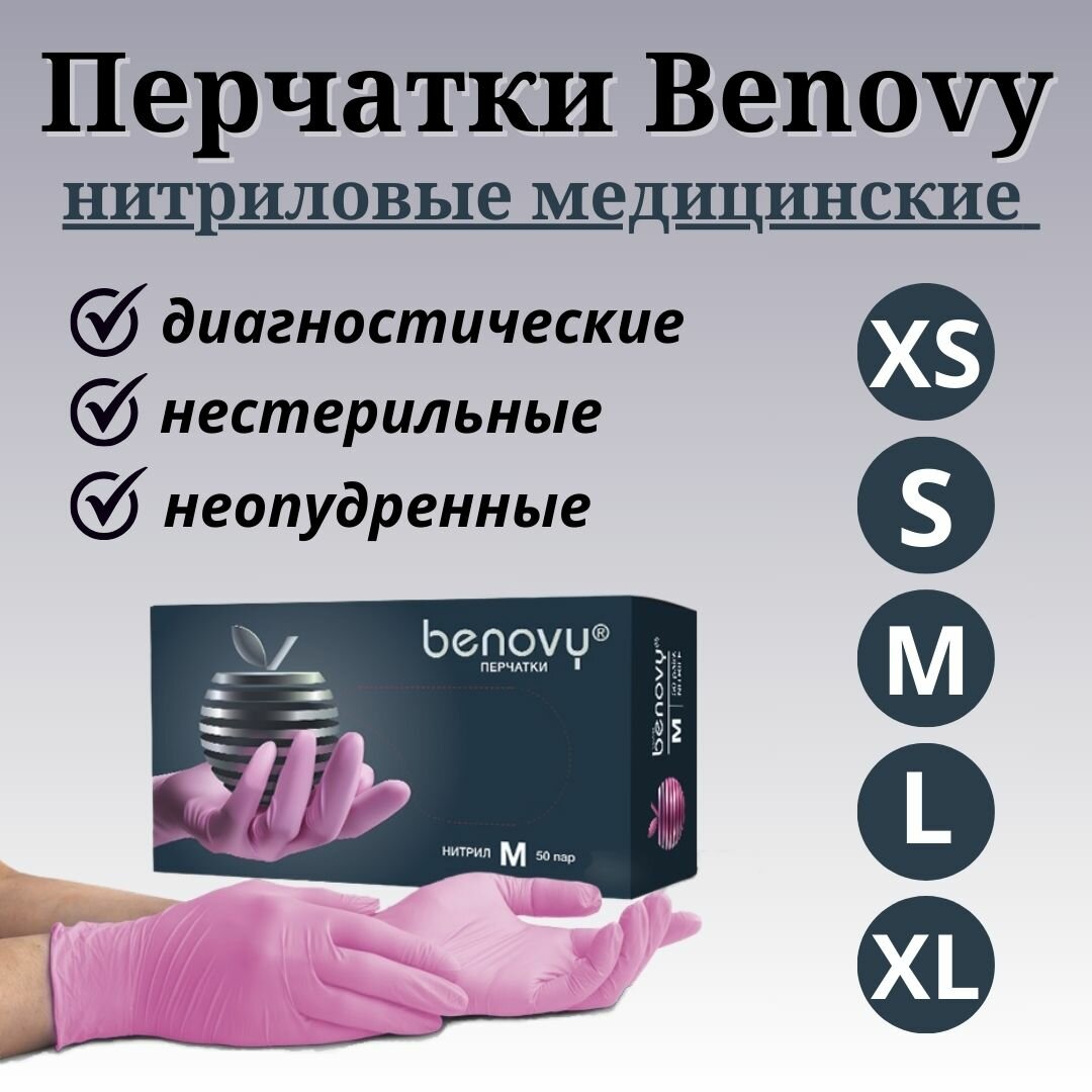 Перчатки нитриловые Benovy (розовые, размер L, 100 штук)