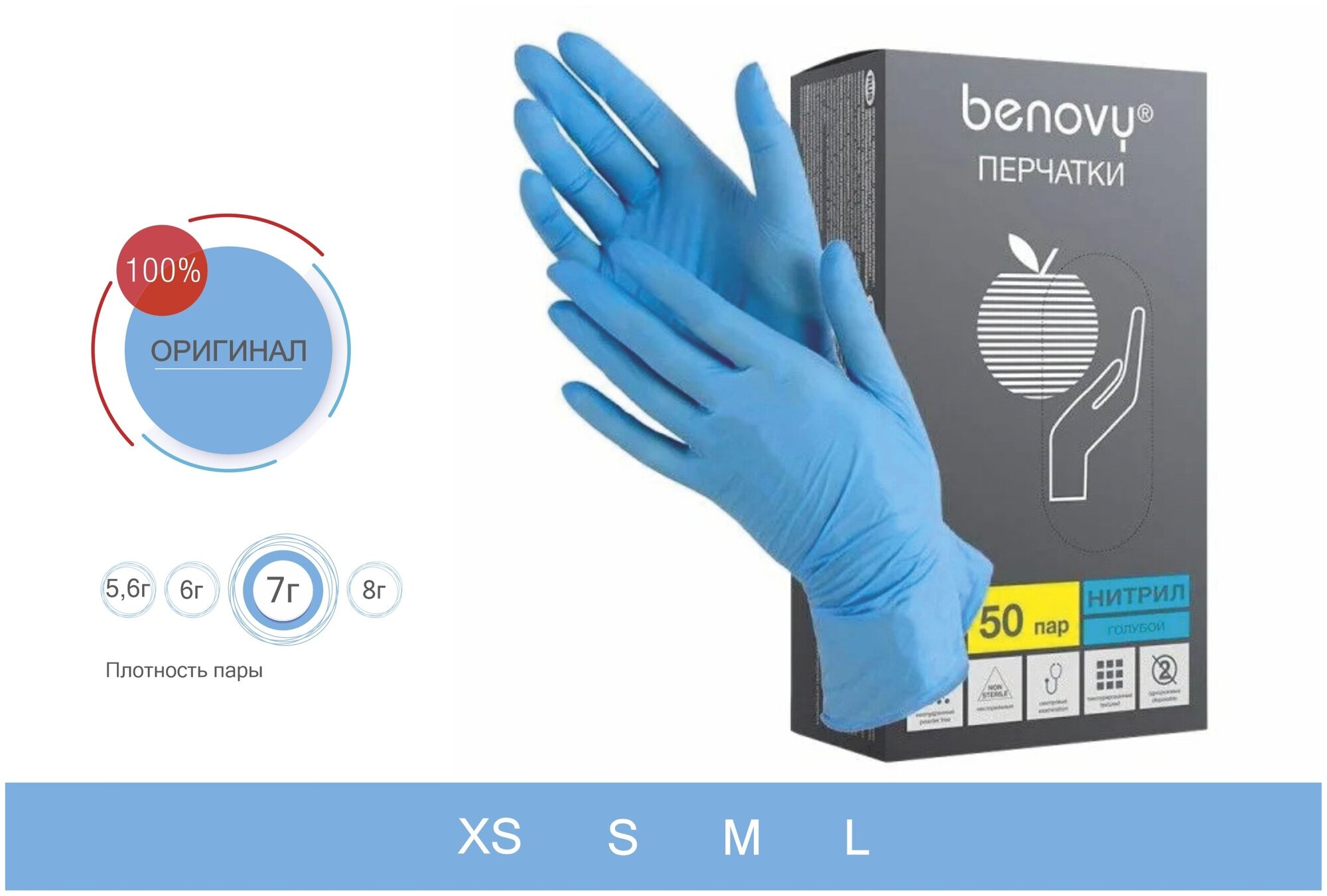 Перчатки Benovy медицинские нитриловые голубые XS 3,0 гр 50 пар(50 шт.)