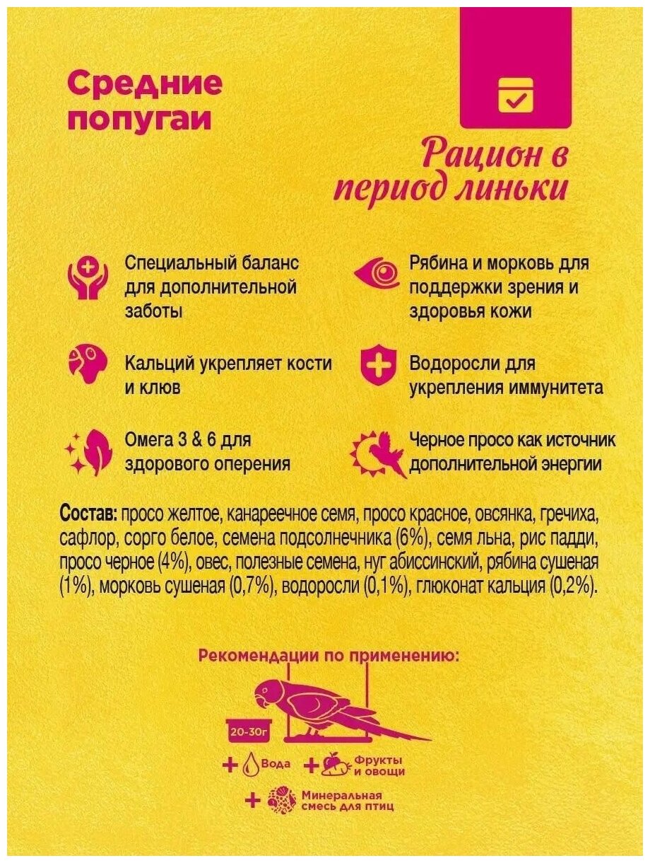 | Отзыв: | корм для средних попугаев в период линьки - беру его обычно еще и для подкормки зимой |