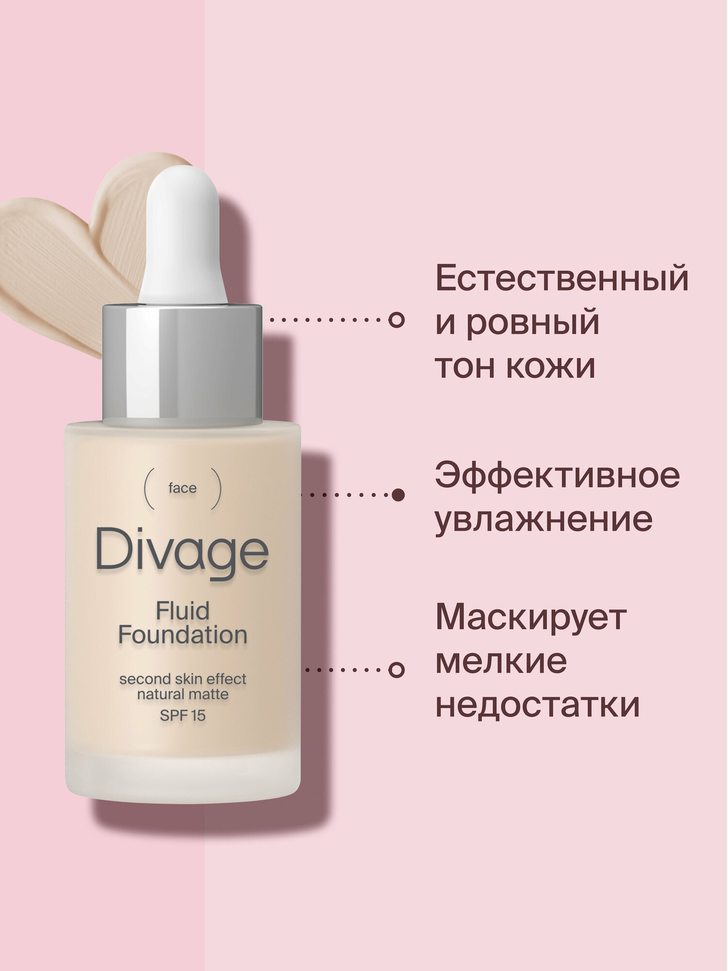 Диваж тональный крем-флюид для лица fluid foundation 01 розовый беж для любого типа кожа 30мл / с матовым финишем защита от солнца / декоративная
