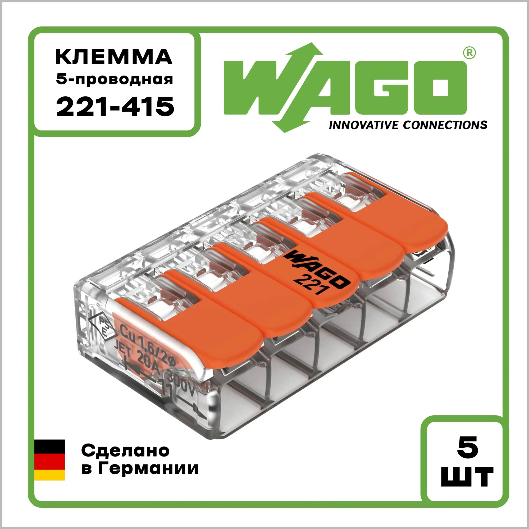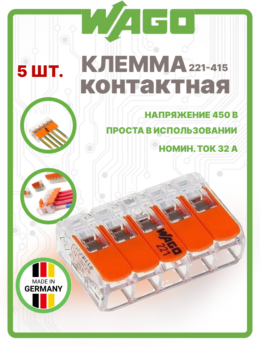 5 проводная клемма Wago 221-415, 20 шт