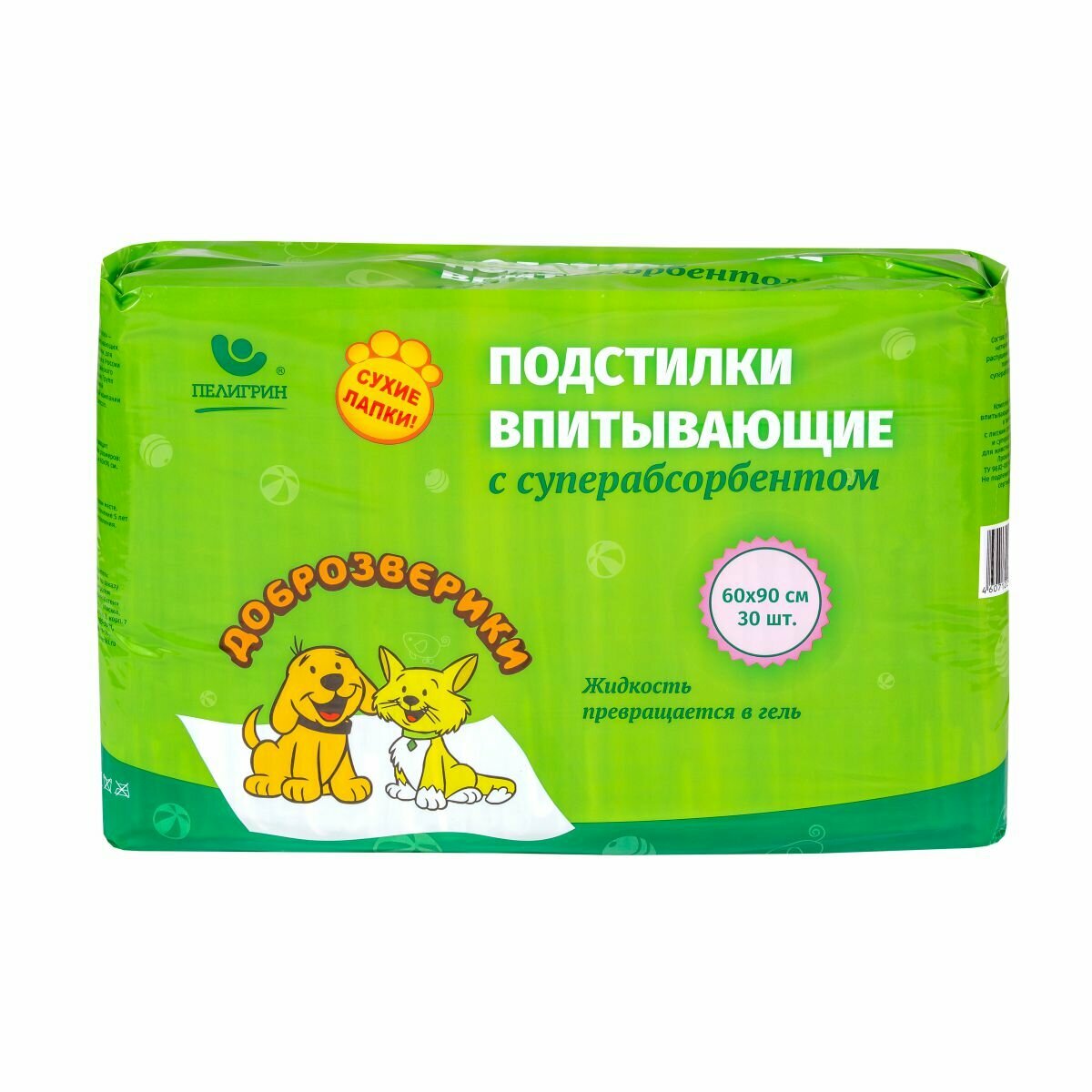Подстилки впитывающие для животных с суперабсорбентом 60*90*4шт Пелигрин Доброзверики