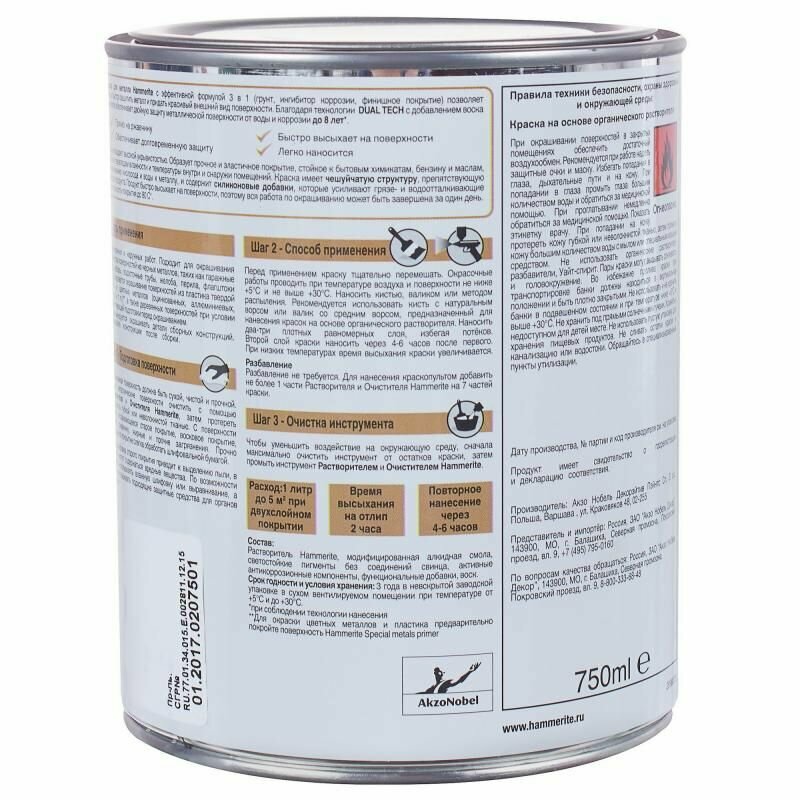 Hammerite Smooth эмаль гладкая по ржавчине 3в1 (серый RAL 7042, 0,75 л)