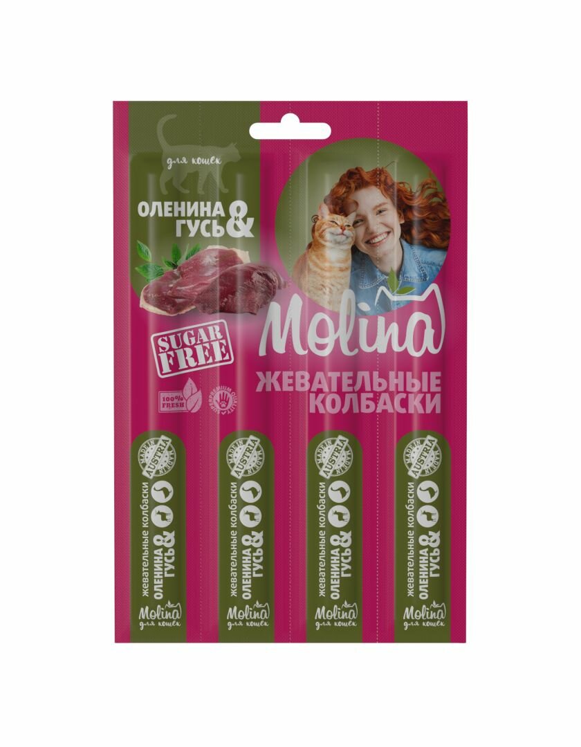 Molina лакомство для кошек, жевательные колбаски, оленина и гусь (4*5гр)