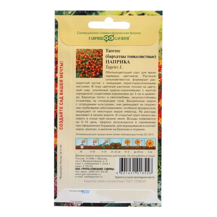 Семена 10 упаковок! Бархатцы тонк. Паприка 0,05г 30см (Гавриш)