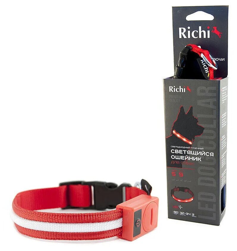 1012 Ошейник RICHI 32-34см (S) красный со светящейся лентой, 3 режима, 2xCR2025 в компл.