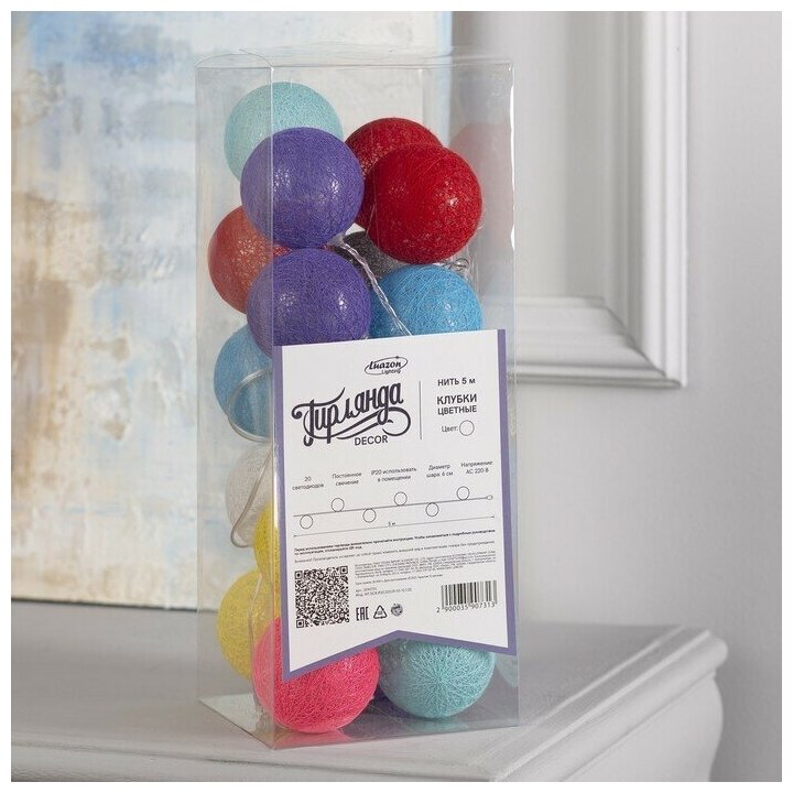 Luazon Lighting Гирлянда «Нить» 5 м с насадками «Клубки цветные», IP20, прозрачная нить, 20 LED, свечение белое, 220 В