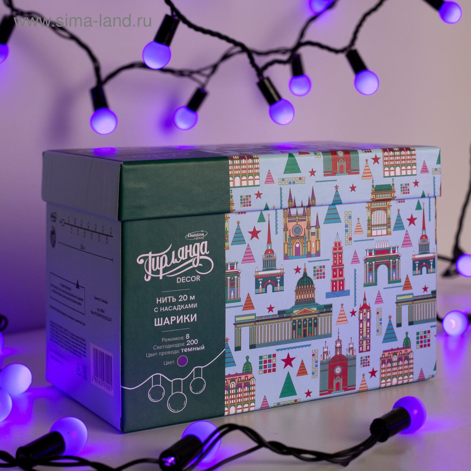 Купить Гирлянда «Нить» 20 м с насадками «Шарики 1.5 см», IP44, тёмная нить, 200 LED, свечение фиолетовое, 8 режимов, 220 В