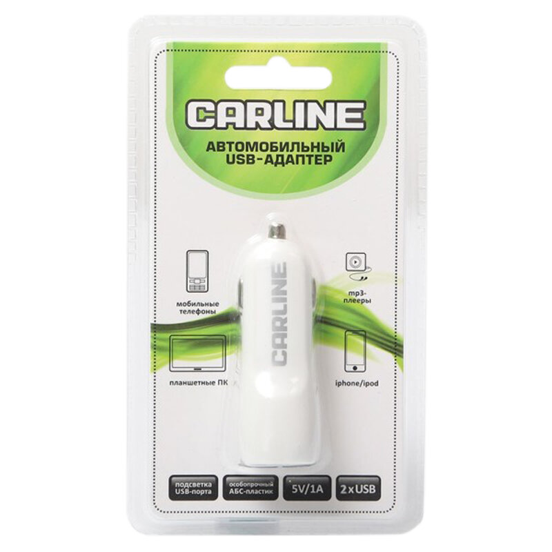 Адаптер автомобильный CARLINE 2хUSB (1A и 2.1А) в прикуриватель 12/24В, цвет белый,упаковка запаянный блистер.