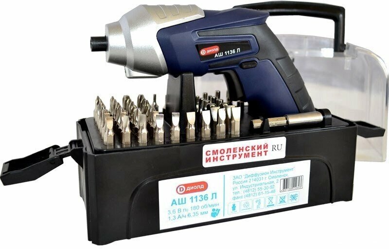 Отвертка аккумуляторная, Диолд, АШ-1136 Л 1002, 3.6 В, 1.3 А.ч, Li-ion, 180 об/мин, 1 скорость, кейс, 6.35 мм, 44 предмета. 306016