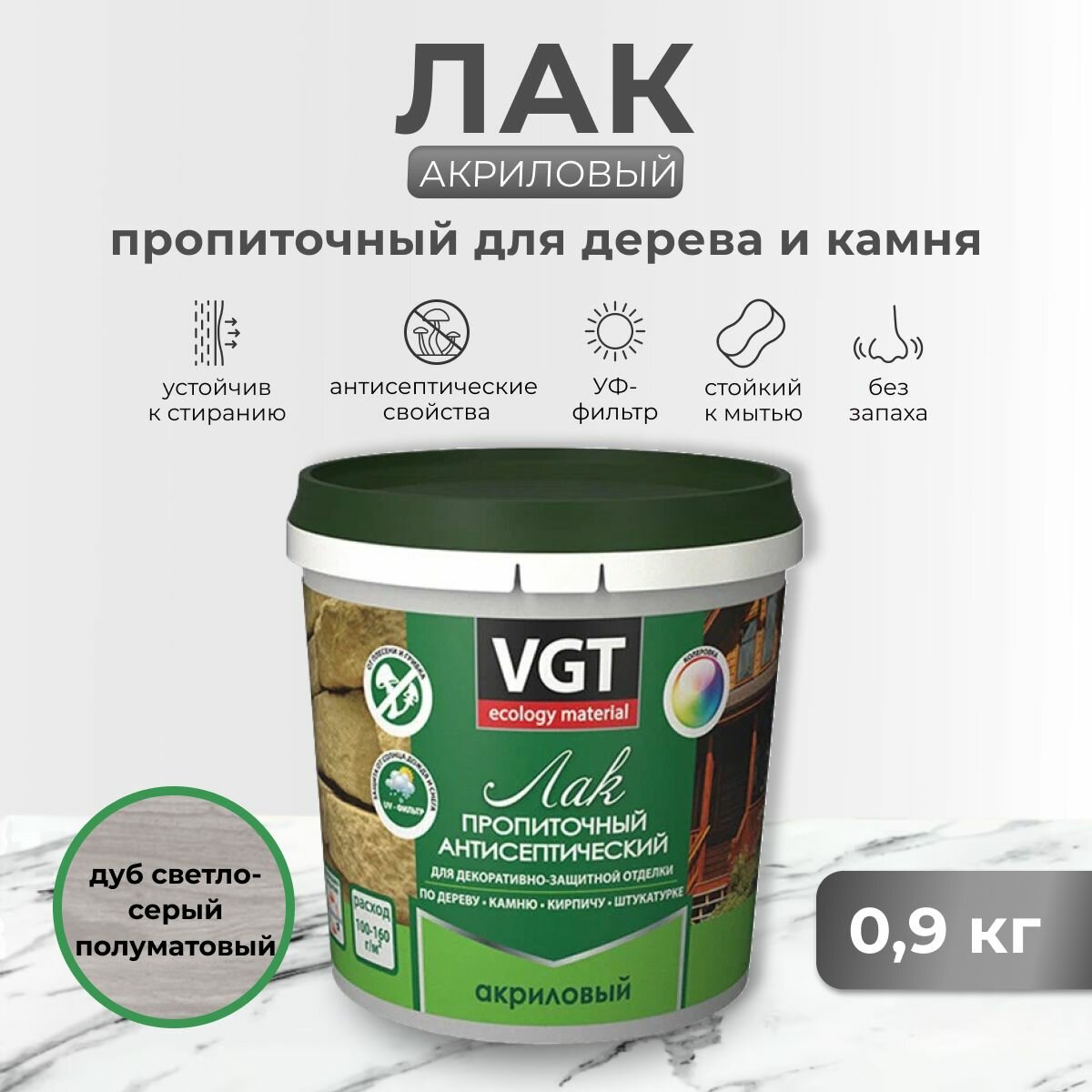 Купить Лак акриловый пропиточный антисептический для дерева и камня VGT (0,9кг) дуб светло серый