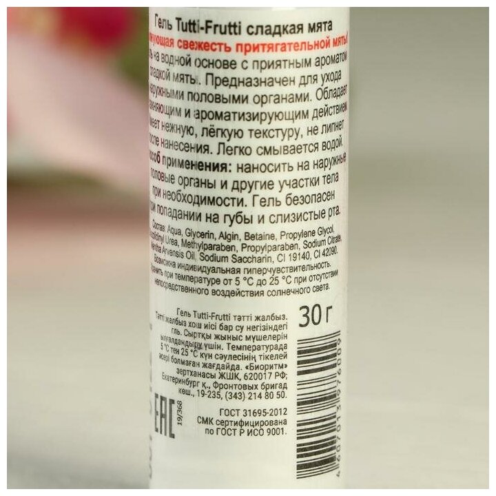 Съедобная гель-смазка лаборатория "биоритм" TUTTI-FRUTTI для орального секса со вкусом сладкой мяты 30г