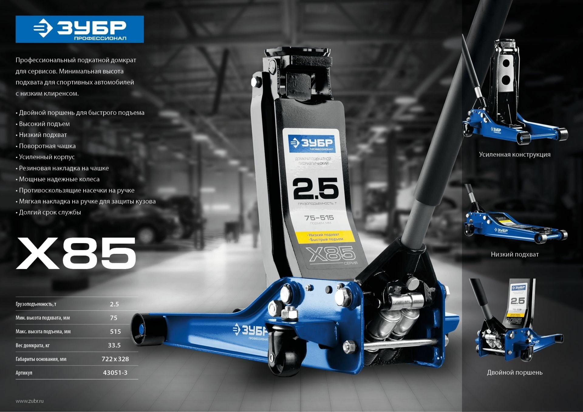 ЗУБР X85, 2.5т, 75-515 мм, Универсальный гидравлический подкатной домкрат для СТО, Профессионал (43051-3)