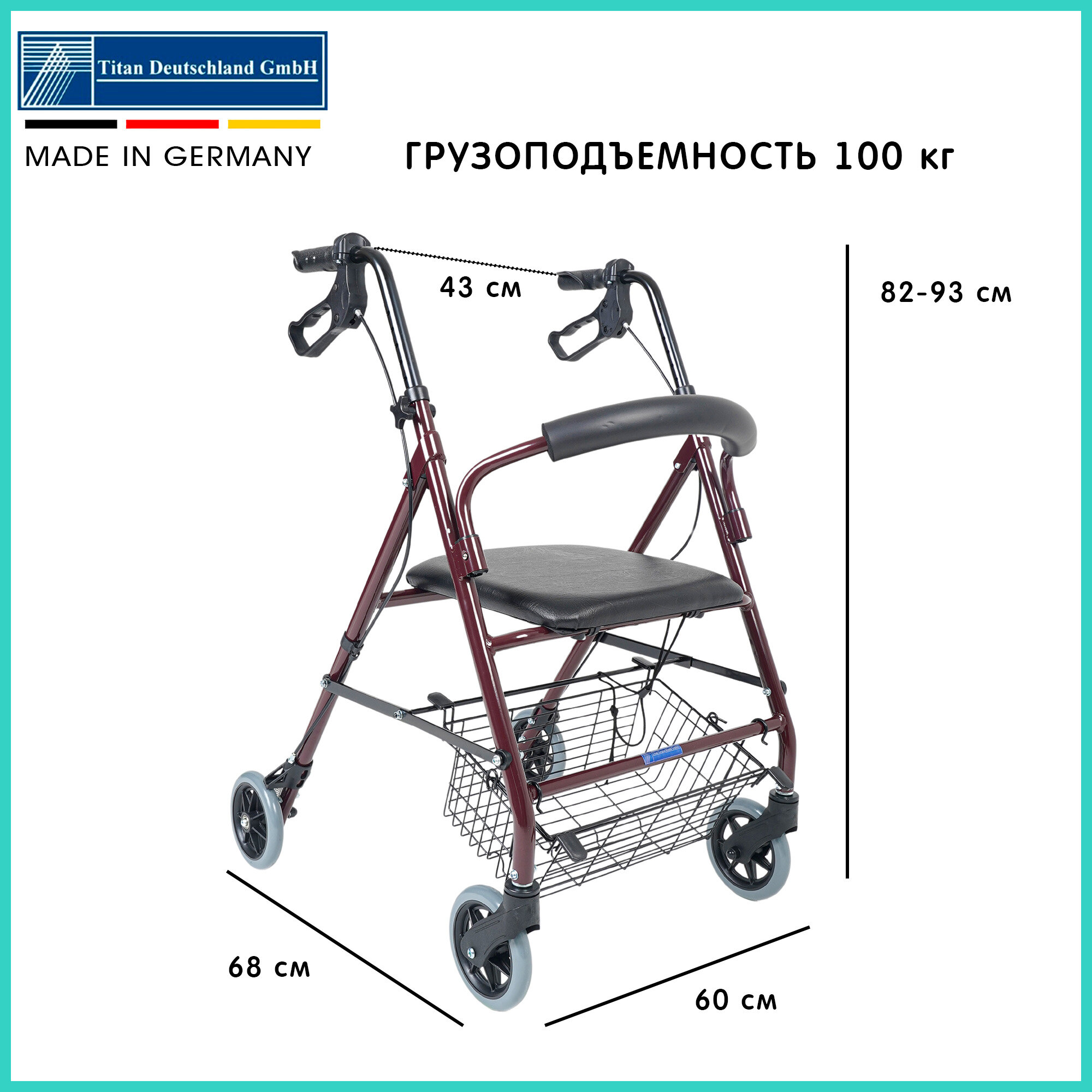 Ходунки роллаторы на четырех колесах германия Titan Deutschland GmbH складные для взрослых, пожилых людей и инвалидов с повышенной грузоподъемностью 130 кг OPTIMAL-KAPPA , LY-561W