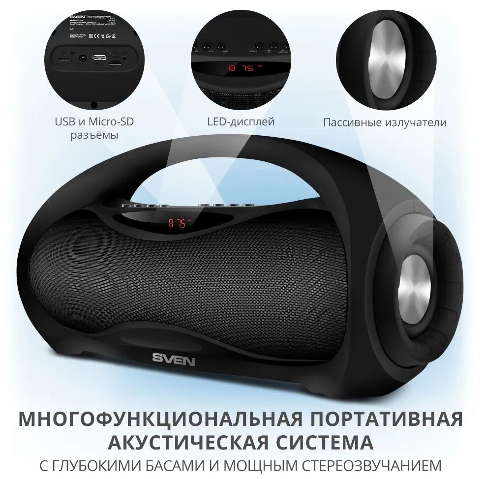 Колонка портативная беспроводная bluetooth SVEN PS-420, переносная с радио и ручкой для переноски / Колонка блютуз музыкальная акустическая / 12 Вт / USB / microSD / LED-дисплей / 1800мА*ч