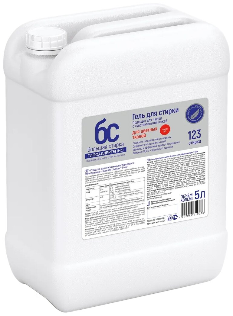 Гель для стирки Большая Стирка, Color , " Для цветных тканей", гипоаллергенно, 5 л