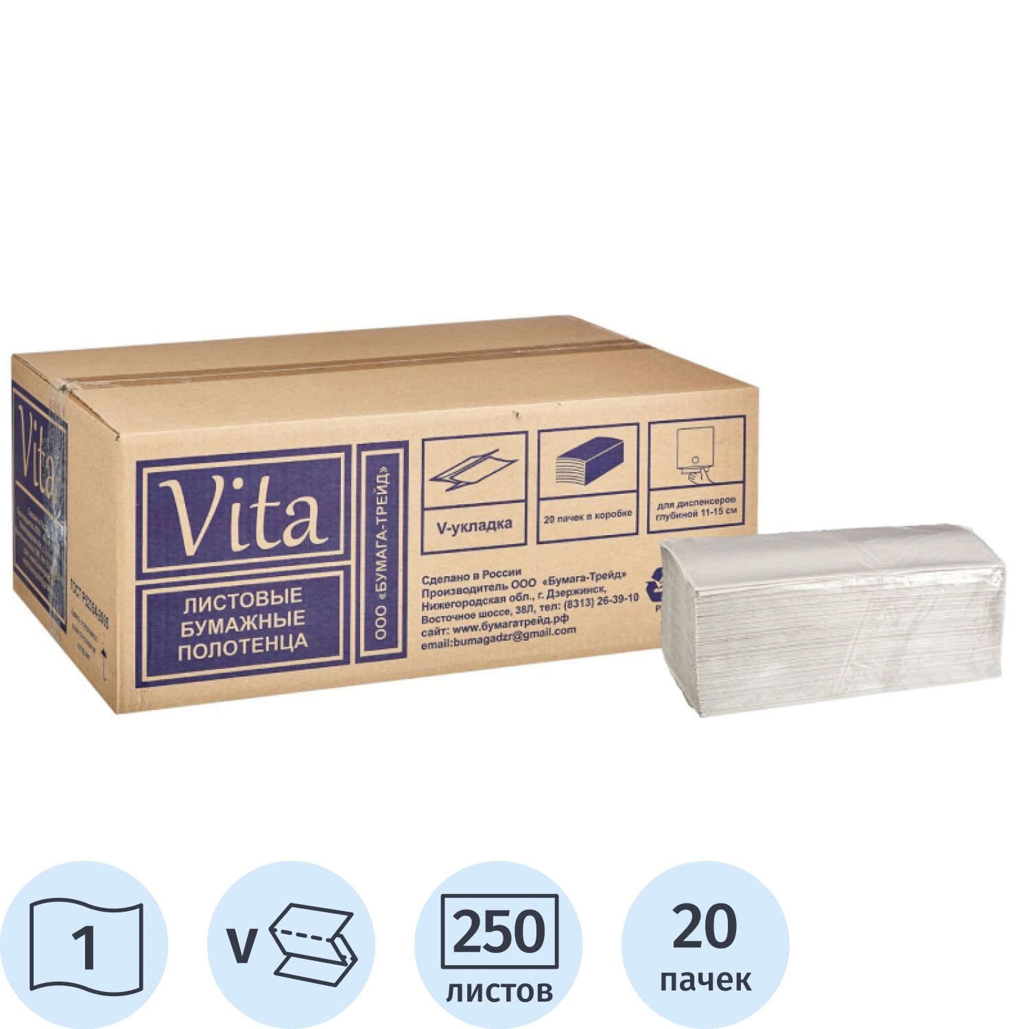 Полотенца бумажные для держателя 1-слойные Vita, листовые V-сложения, 20 пачек по 250 листов (NV-250W1)