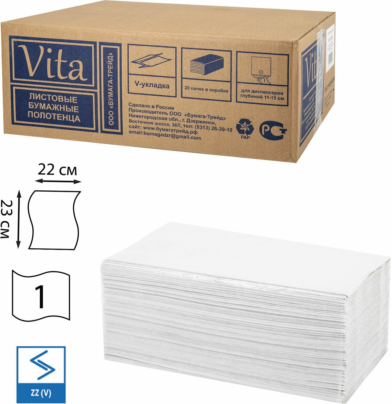 Полотенце гигиеническое бумажное V сложения VITA, 23х23 сантиметра, цвет белый, 1слойные, 4000 листов, 20 штук в коробке. (артикул производителя NV-200N1)