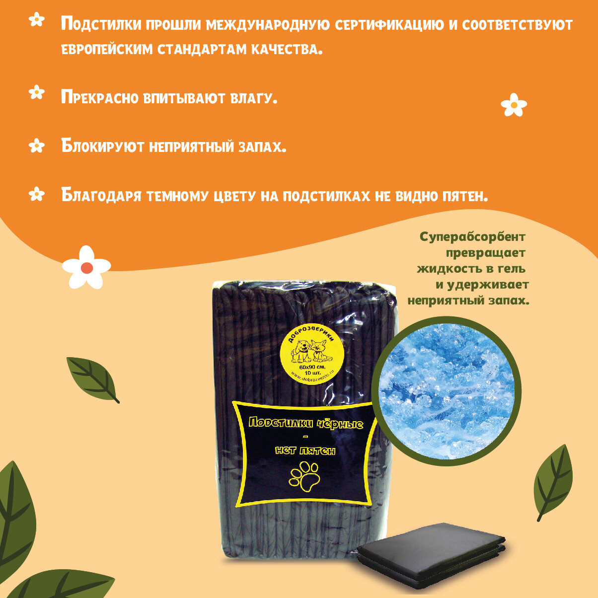 Доброзверики подстилки впитывающие для животных с суперабсорбентом 60х90 см, 10 шт, черные