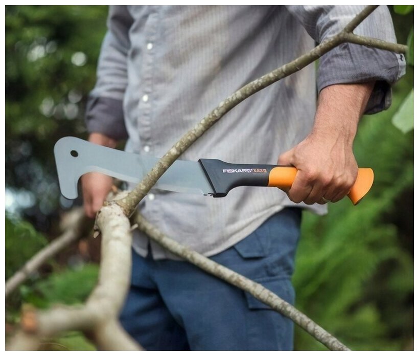 Идеальная форма для борьбы с кустарником (Отлично рубит и за счет "крючка" на конце помогает собирать ветки). После обработки примерно 250 м2 от сплошных зарослей на пару с секатором этой же фирмы на лезвия ни одной зазубрины. При этом одним ударом перепутал ветки в диаметре 3 см, а за 2-3 удара и ствол 4-5 см! Очень легкий (вес сконцентрирован в лезвия, что позволяет без сильной нагрузки на руку делать отличные удары) |