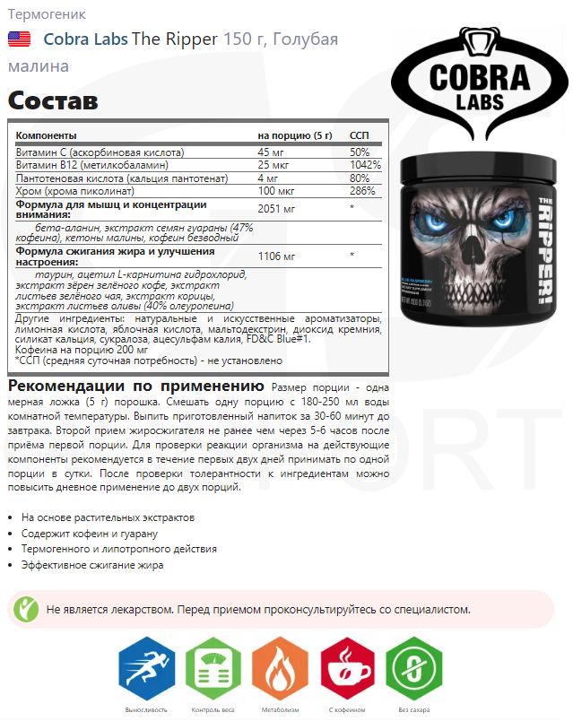 Он рабочий. После приема натощак с утра, уже через 10 минут приятное покалывание под кожей, появляется желание пойти потренить. Регулирует аппетит, Ем 3 раза в день, но через силу и порции значительно меньше. Если питаться дробно, эффект будет еще лучше. С утра ложку, через 5 часов еще ложку и перед тренировкой за пол часа предтрен. Плюс курс тестобустера. В зале чувствую себя Одином. Не рекомендация, смотрите по здоровью сердца и ЦНС В общем The Ripper хорош! |