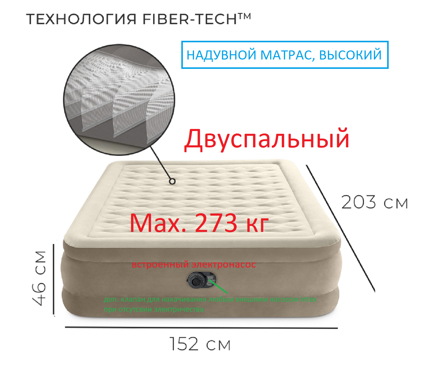 Надувная кровать двуспальная, 152 х 203 х 46 см, Intex Queen Ultra Plush Fiber-Tech, насос 220В, 64428ND