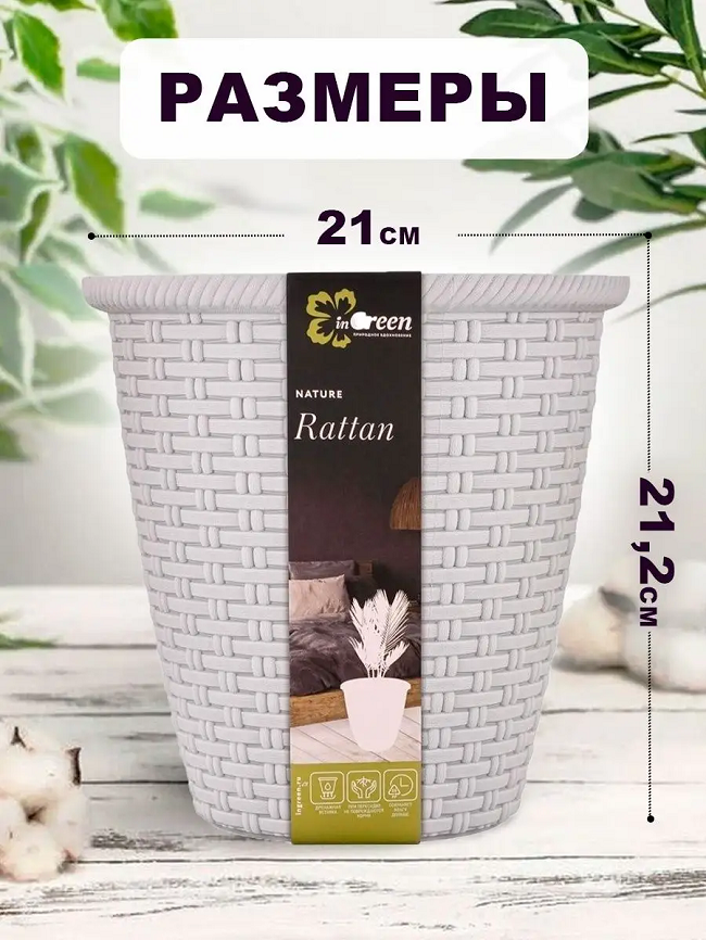 Кашпо Rattan диаметр 210 мм 4,5 л с внутренним горшком 2,25 л сливочный InGreen