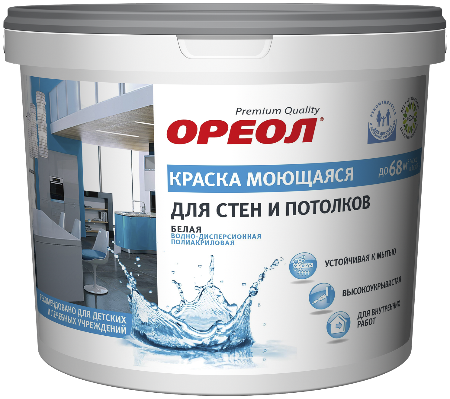 Краска водоэмульсионная Ореол для стен и потолков моющаяся белая, 13 кг