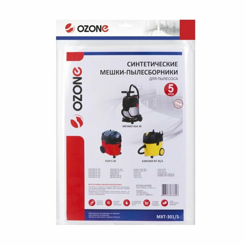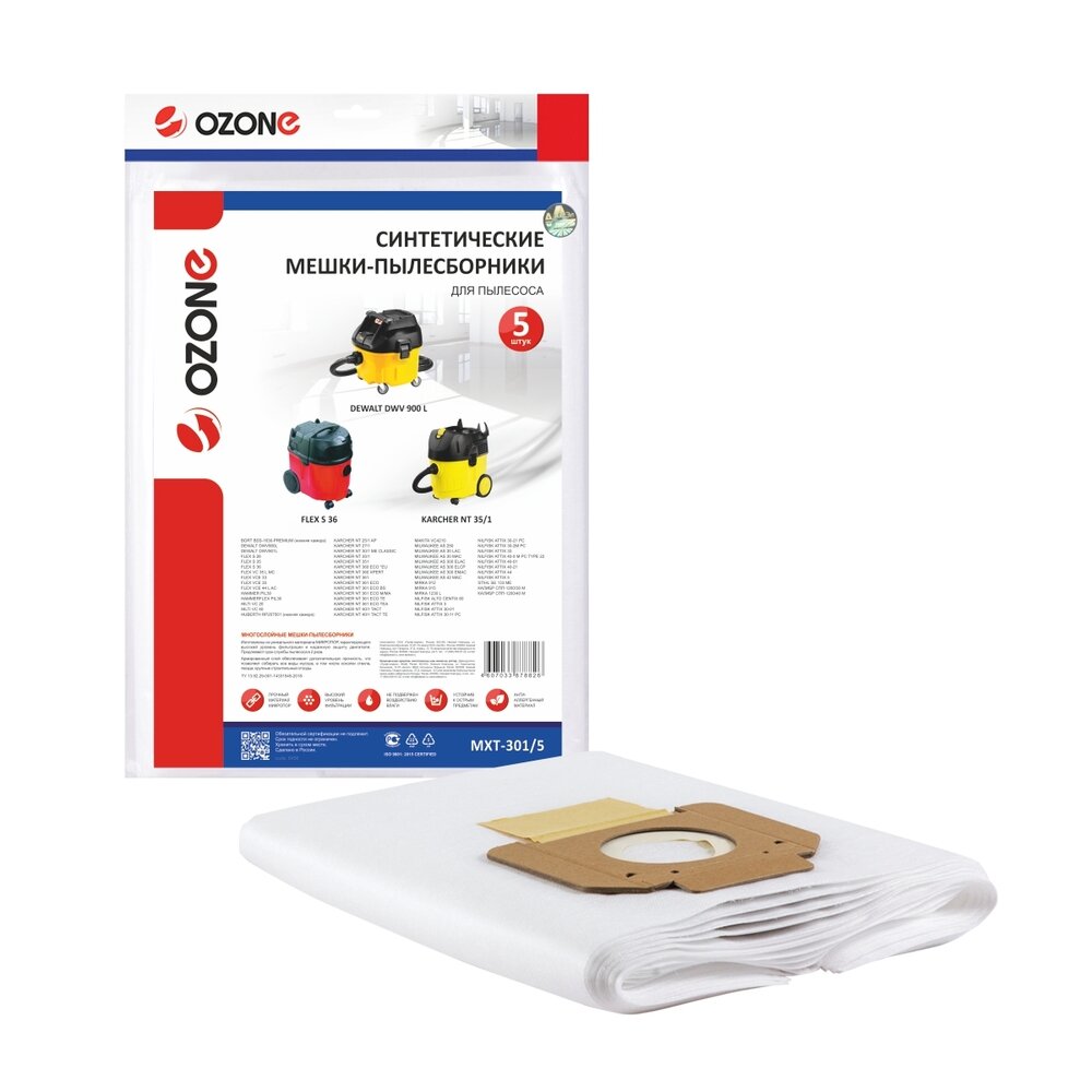 Синтетические мешки-пылесборники Ozone MXT-301/5 для пылесоса KARCHER NT 35/1, DEWALT, FLEX, HAMMER и других, 5 шт