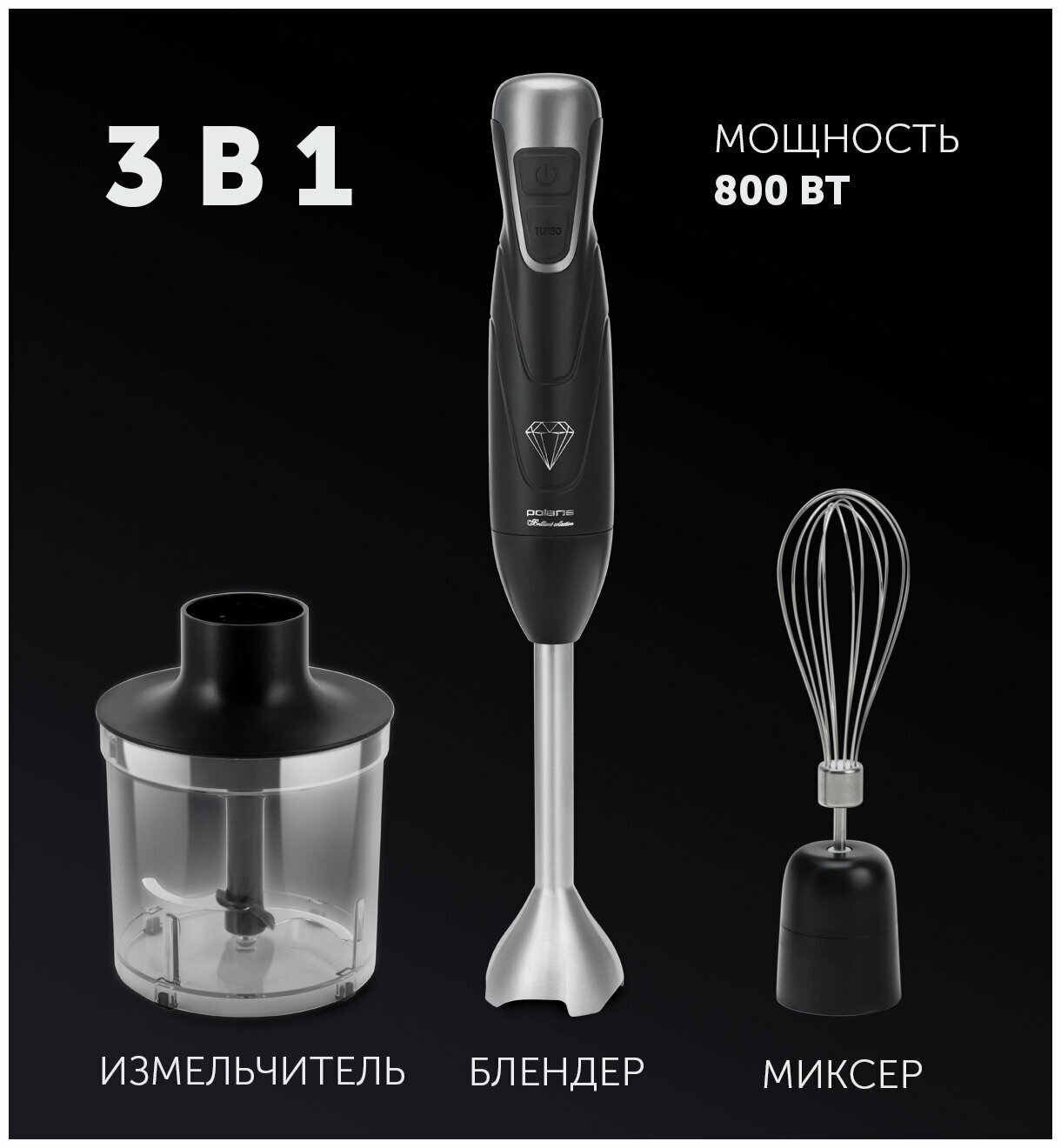 Блендер погружной POLARIS PHB 0848, 800Вт, 2 режима, измельчитель, венчик, стакан, черный