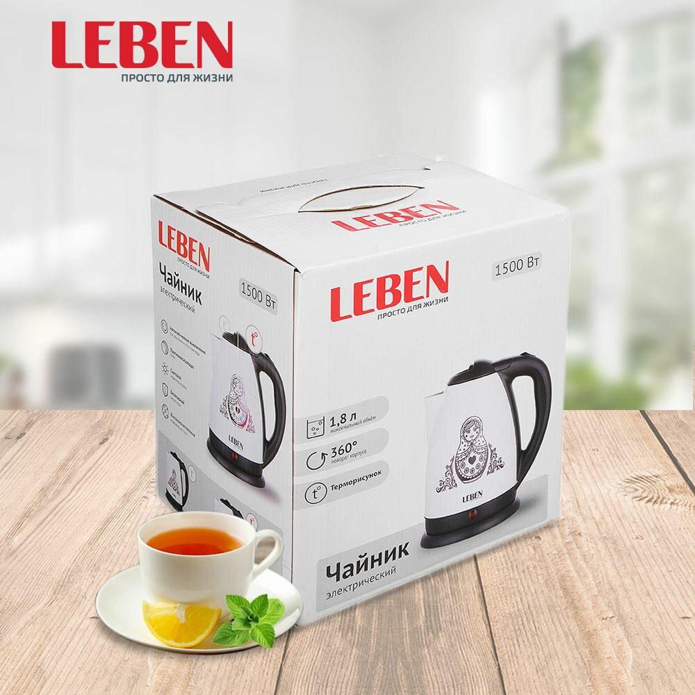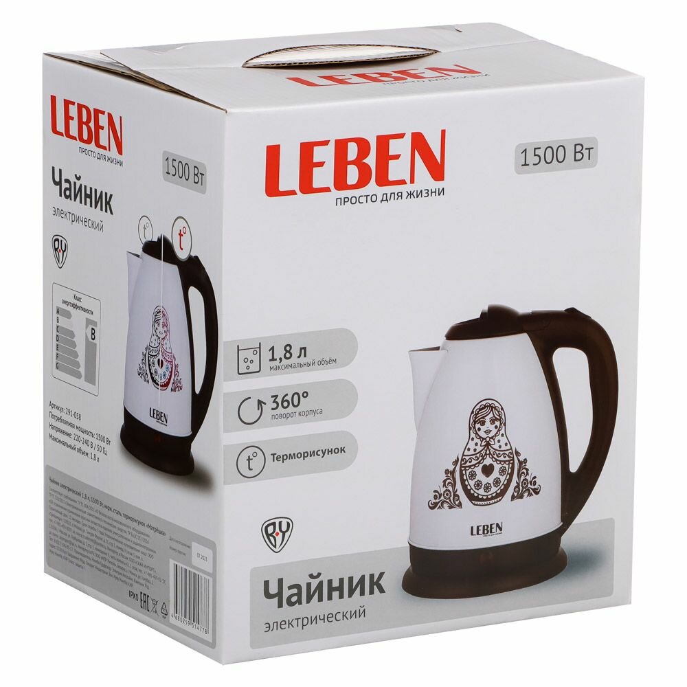 Ниже Вы можете прочитать отзывы на LEBEN Чайник электрический 1,8л, 1500Вт, нерж. сталь, терморисунок матрешка, ознакомится с подробными характеристиками, посмотреть интересные обзоры и фотографии на LEBEN Чайник электрический 1,8л, 1500Вт, нерж. сталь, терморисунок матрешка.