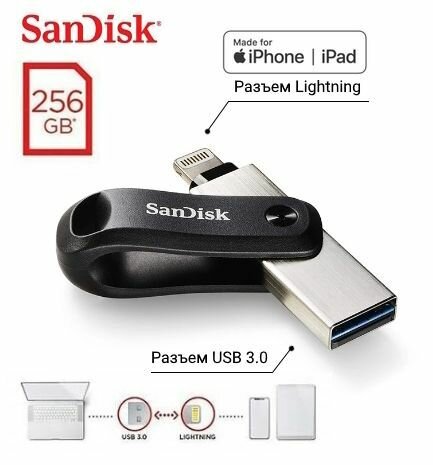 Купить Флешка SanDisk iXpand Go USB 3.0/Lightning 256 ГБ, 1 шт., черный
